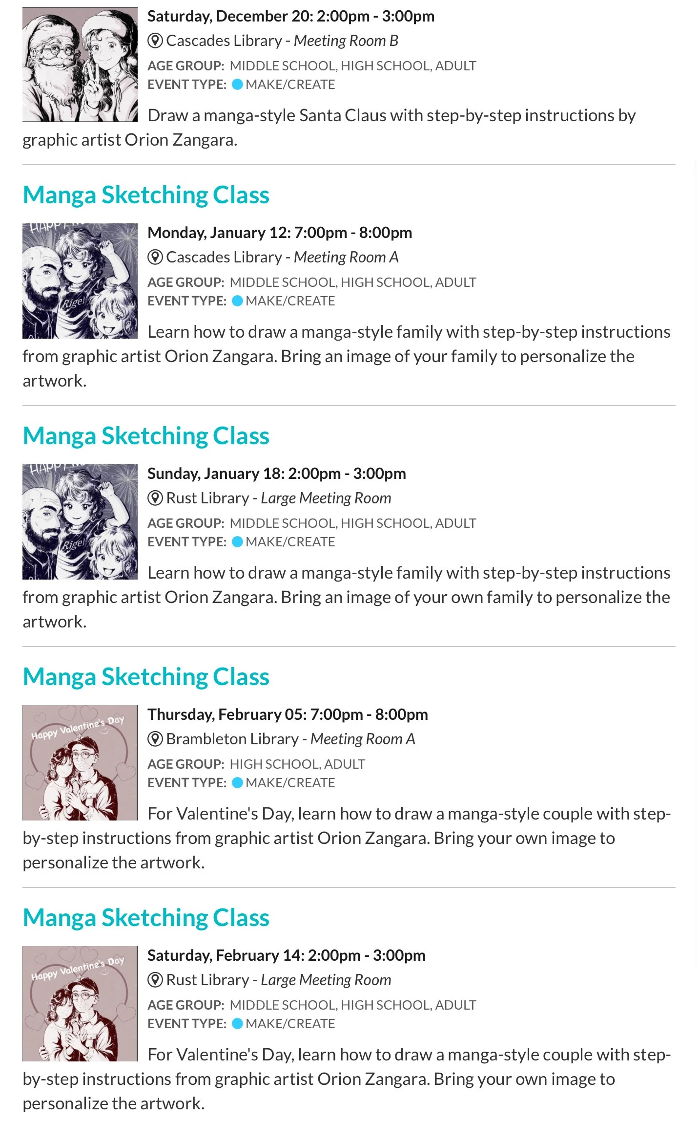 Manga Art Workshops for Loudoun County Public Libraries Hello there! Here are my upcoming manga art workshops for the fantastic Loudoun County Public Libraries in Loudoun County, Virginia: bit.ly/48WYx7h I look forward to seeing some of you there! :) Orion ZangaraDecember 26, 2025Comment Facebook0 Twitter LinkedIn0 Reddit Tumblr Pinterest0 0 Likes